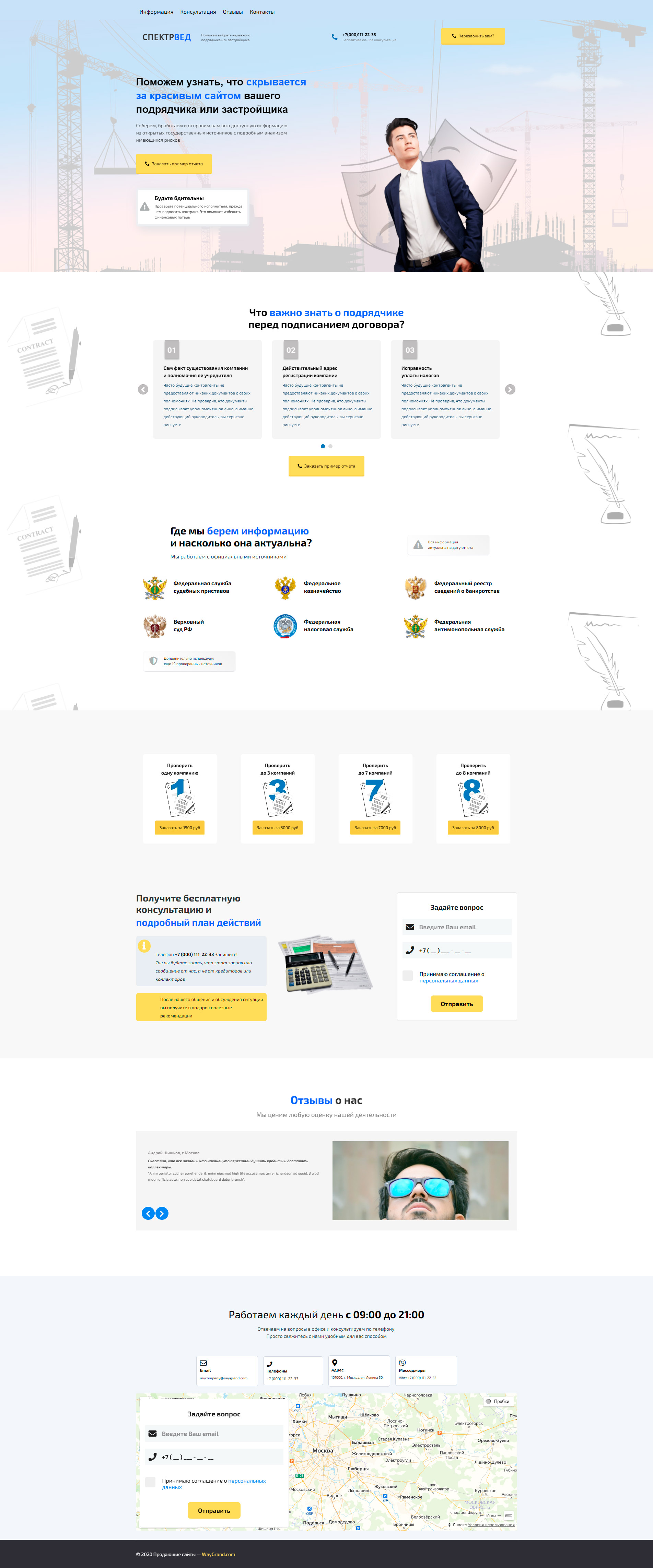 - Промоблок "Поможем узнать, что скрывается за красивым сайтом вашего подрядчика или застройщика" с кнопкой призыва к действию "Заказать пример отчёта"