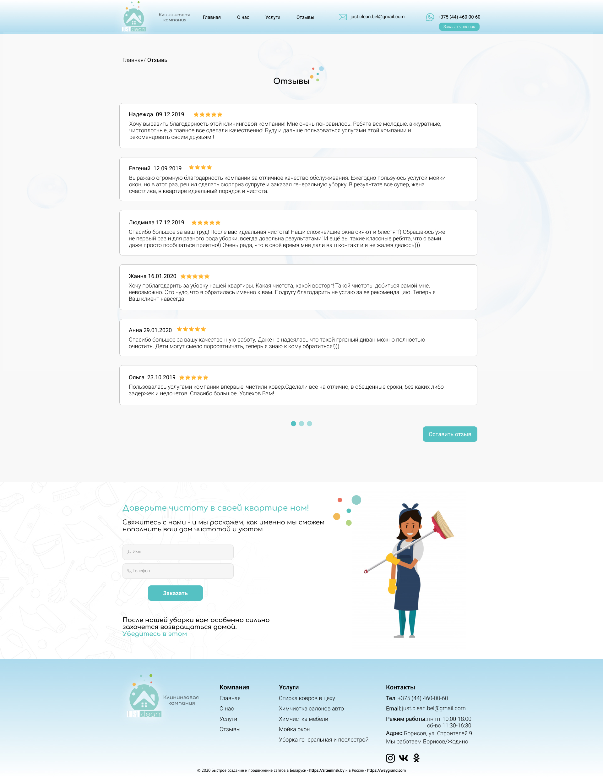 Обратился в данную компанию за разработкой сайта для моей организации. Мы занимаемся оказанием клининговых услуг. Сайт оказался легким, информативным, лаконичным. Легок в управлении. Остался всем доволен. Выражаю огромную благодарность в помощи создания сайта.