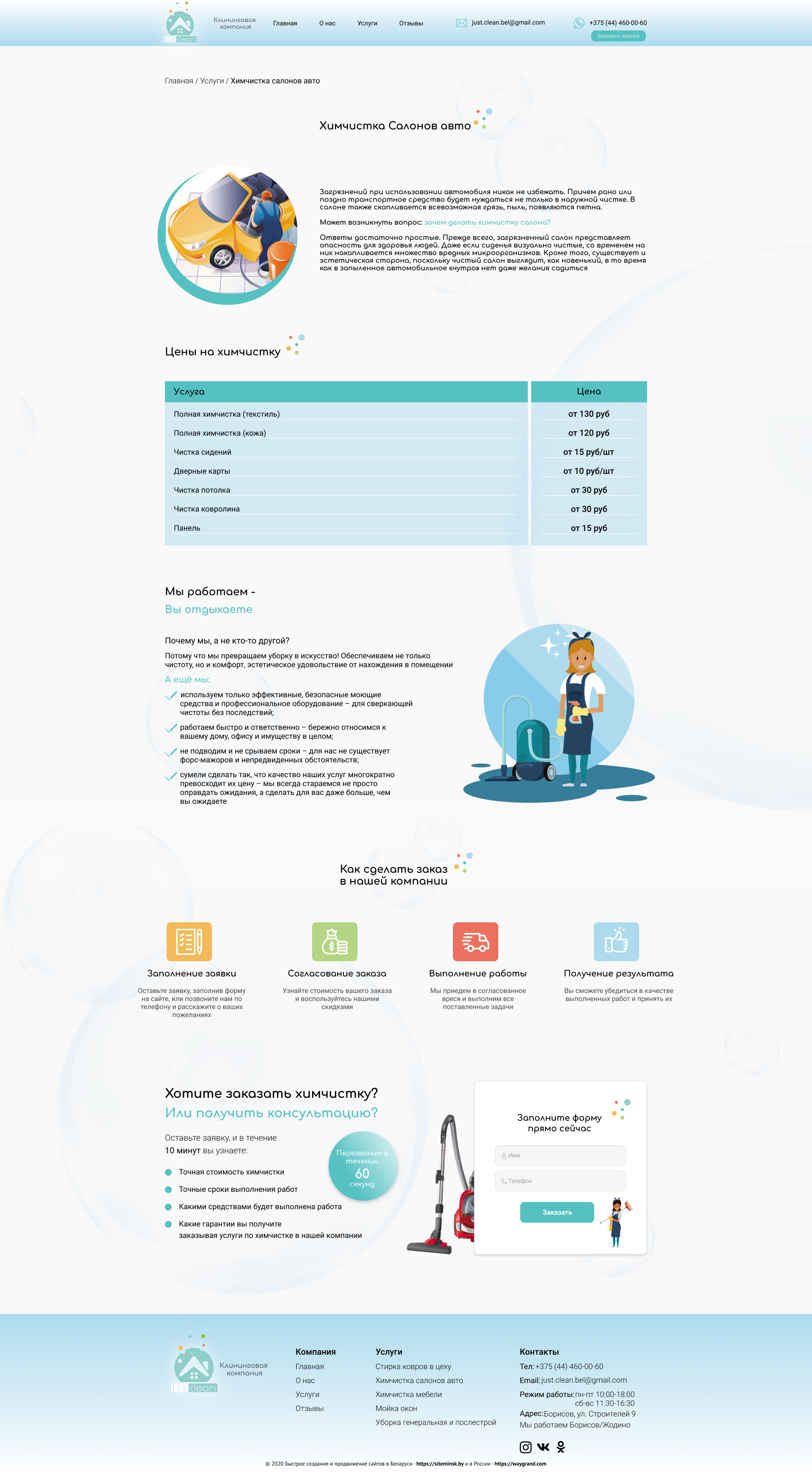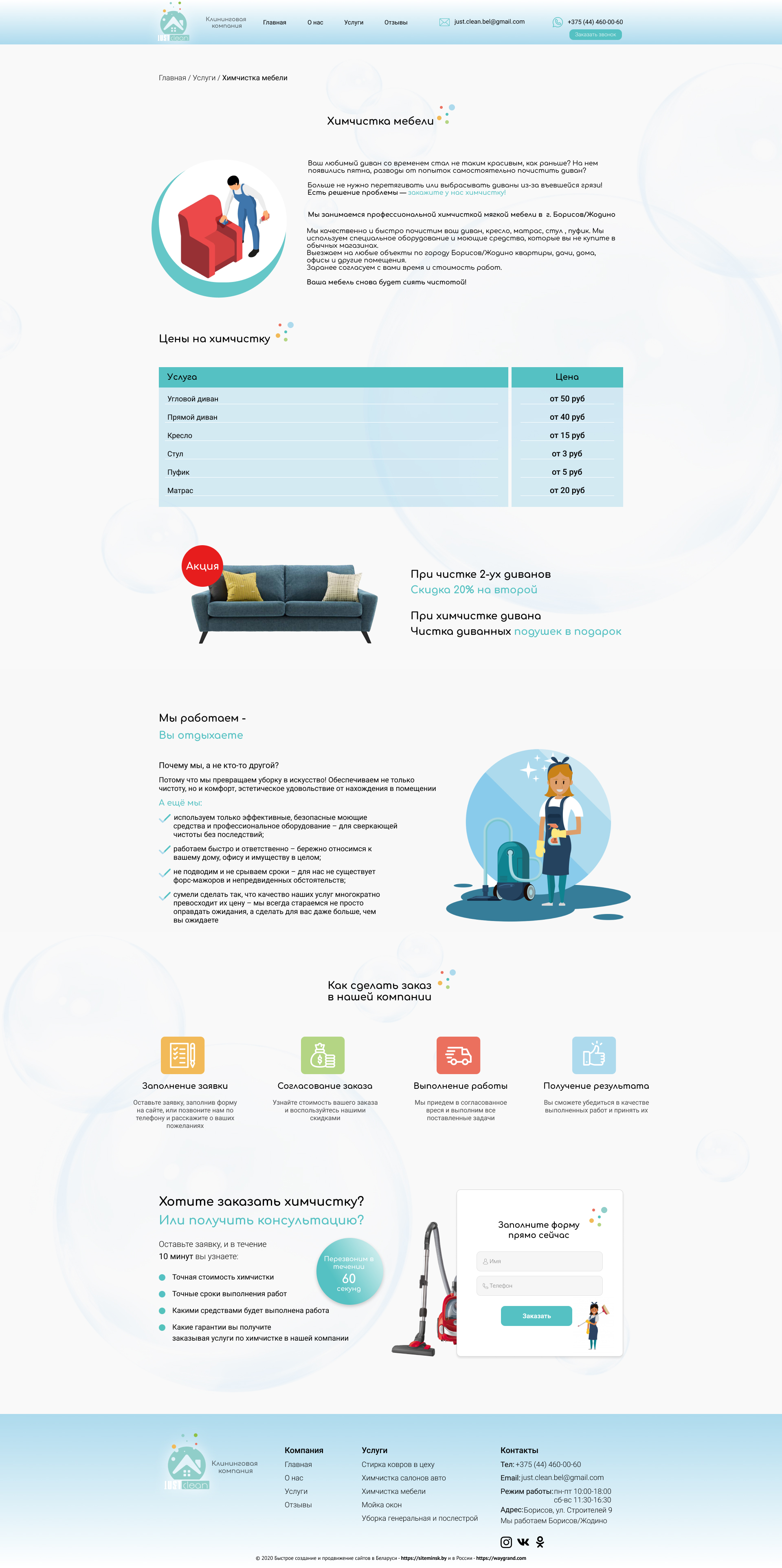 - Промоблок "Профессионально очистим любые поверхности" с кнопкой призыва к действию "Каталог"